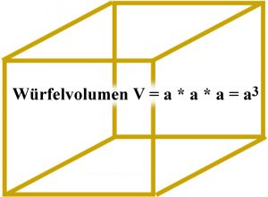 Das Volumen eines Würfels kann man auch als Inhalt oder Rauminhalt des Würfels bezeichnen. Das Volumen – meistens mit V bezeichnet – eines Würfels, berechnet sich aus Länge * Breite * Höhe. Da alle Seiten des Würfels gleich lang (Länge = Breite = Höhe = a) sind, bestimmt sich das Volumen V eines Würfels nach der folgenden Formel: